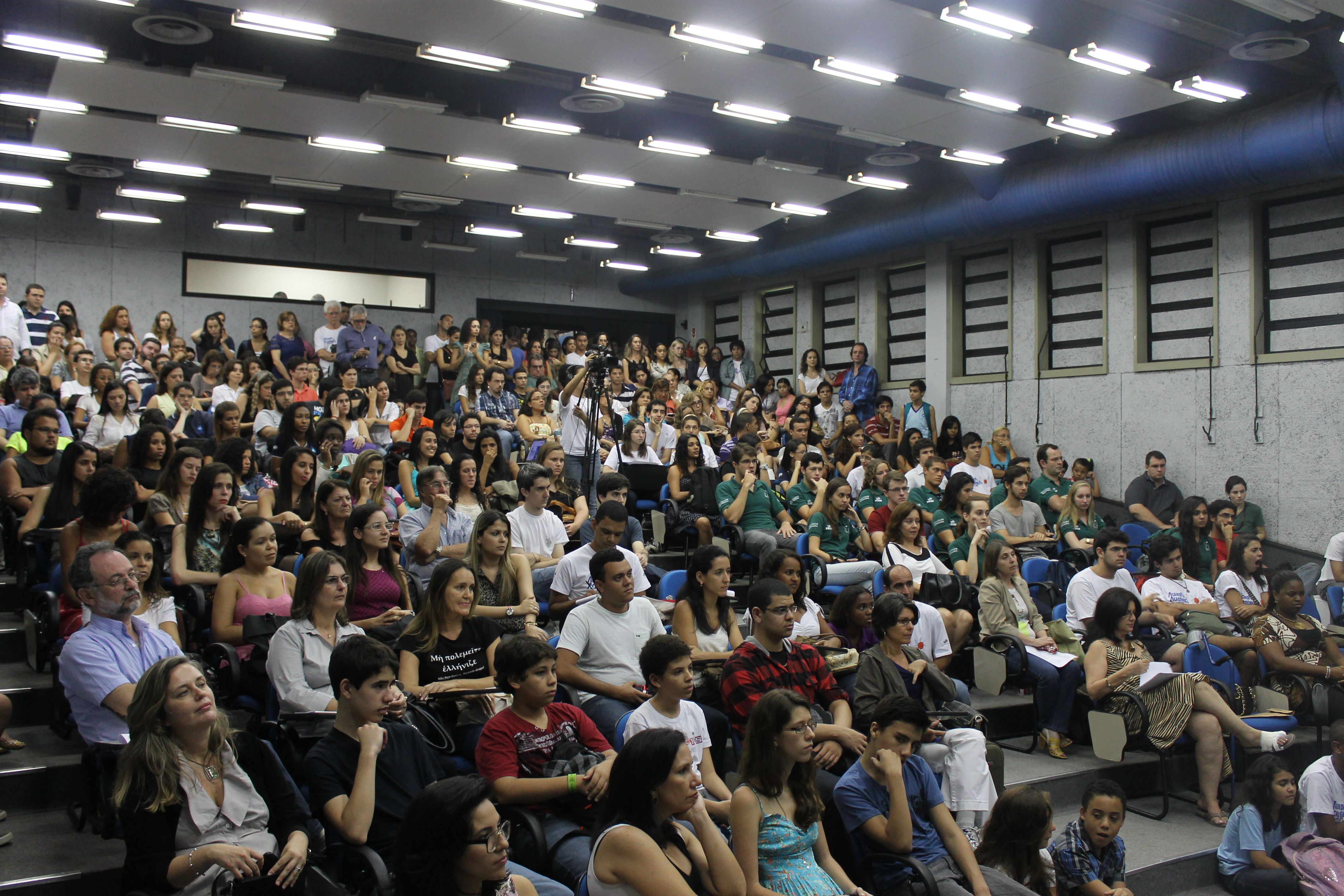 O auditório Florestan Fernandes esteve lotado na tarde de sexta-feira, 25 de outubro, no evento que encerrou a edição de 2013 da Agenda Acadêmica, que mostra a produção da UFF nos campos de ensino, pesquisa e extensão. A cerimônia contou com a presença de diversos dirigentes, professores e alunos, premiando iniciativas integradas à universidade e passando também por projetos dos ensinos médio e fundamental dos quais a instituição participa.